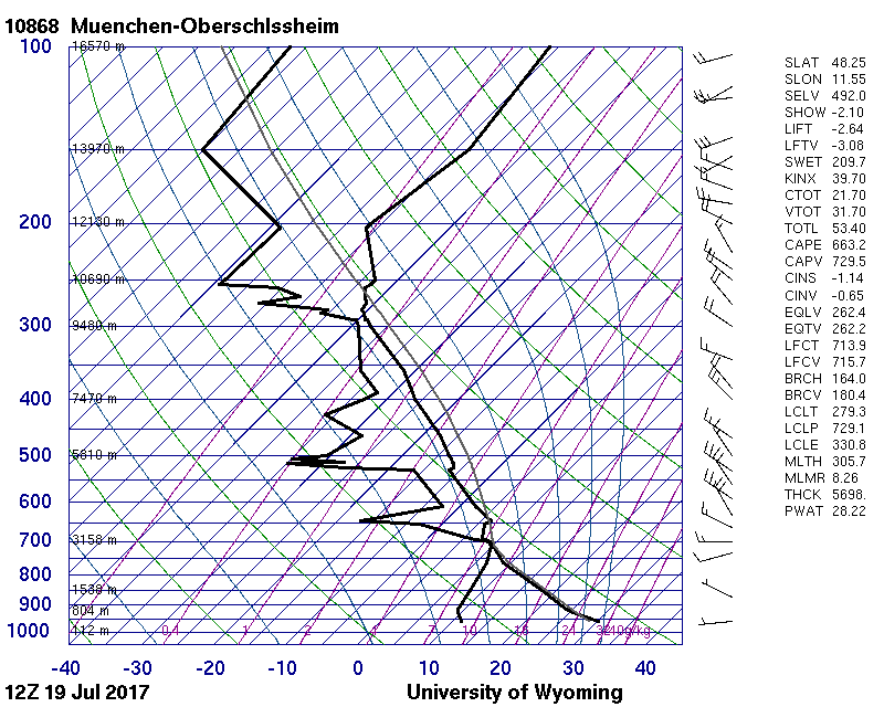 Six hours earlier, a bit upstream, a dry boundary layer has been present (inverted V profile), with modest CAPE values up to the tropopause. Dry upper levels indicated the increasing subsidence from the incoming ridge. This process further increased until the evening preventing deep moist convection at all. And that’s where I need Doswell’s conceptual model each time when I try find out the cause and effects of meteorological mysteries.