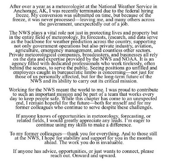 • Frau Cowan: rund um die Uhr tätig beim Pacific Tsunami Warning Center, zuständig für seismische Überwachung und Tsunami-Prognose, um die Öffentlichkeit zu schützen, wurde ebenfalls gekündigt. Ihr Mann hat dazu ein Statement auf Bluesky veröffentlicht (siehe Titelbild)