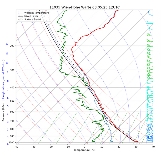 Vor den ersten Gewittern war die Grenzschicht im gesamten Donauraum recht trocken mit hohen Taupunktsdifferenzen.