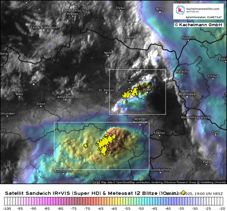 Bereits vor der Ankunft der Gewitterzelle in Wien bildete sich ein hochreichender Gewitteramboss mit Cloud Top Temperature um -60°C. Das entspricht rund 11km Höhe. Der Amboss über dem Semmeringgebiet ist sogar knapp -70°C kalt. In beiden Fälle, bei Wien noch deutlicher, findet die größte Blitzaktivität nun an der Rückseite des Gewitters statt.