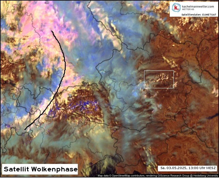 In den Wolkenphasen-Satellitenbildern der neuen Generation sah man um 13 Uhr die vorlaufende konvektive Auslösung über dem östlichen Bergland, gefolgt von einem breiten Cirrusgürtel, der auch Saharastaub vor sich herschob. Die wolkenarme Zone zwischen dem Cirrusband und der Front über dem Westen verlagerte sich bis in den Osten, mit immer schärferer Wolkenkante. Möglicherweise gab es hier ein ausgeprägtes Maximum potentieller Vorticity (Dipol-Struktur) bzw. Hebungszone, gefolgt von einer Absinkzone, vor der zweiten Hebungszone im Westen.