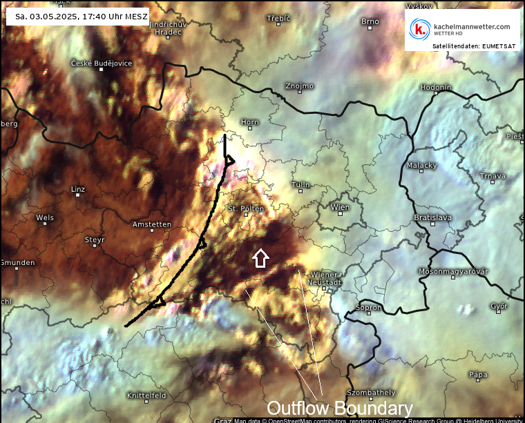 Gegen 17.30-17.40 Uhr löste sich von zusammenfallenden Zellen über dem östlichen Bergland eine sichtbare Outflow Boundary ab, die nach Nordwesten – also entgegen der Verlagerungsrichtung der nachfolgenden Konvergenzlinie (hier als schwarze Kaltfront dargestellt) zog.