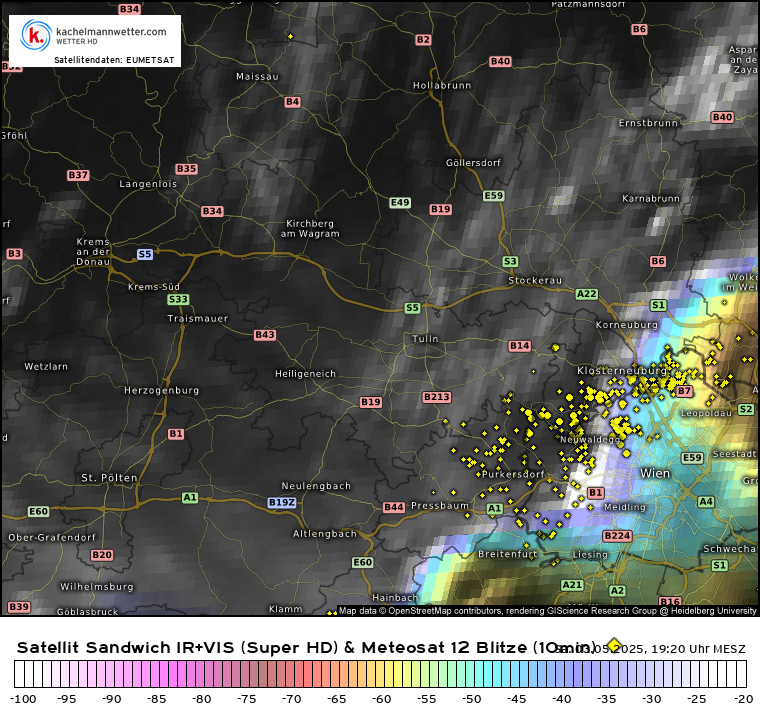 Bereits vor der Ankunft der Gewitterzelle in Wien bildete sich ein hochreichender Gewitteramboss mit Cloud Top Temperature um -60°C. Das entspricht rund 11km Höhe. Der Amboss über dem Semmeringgebiet ist sogar knapp -70°C kalt. In beiden Fälle, bei Wien noch deutlicher, findet die größte Blitzaktivität nun an der Rückseite des Gewitters statt.