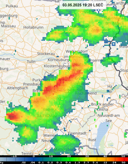 Dieser Tag bot allgemein eine spannende Gewitterlage und gleichzeitig den ersten 30er im Nordosten von Österreich in diesem Jahr (30,3°C in Poysdorf und Wien-City). Am Nachmittag zog eine erste Gewitterstaffel aus den Alpen heraus nordostwärts und querte Teile von Wien mit kräftigen Regengüssen und auflebendem Wind. Nach vorübergehender Beruhigung zog vor Sonnenuntergang vom Mostviertel her eine Gewitterlinie heran, die über bzw. östlich von Wien ihre maximale Intensität erreichte.