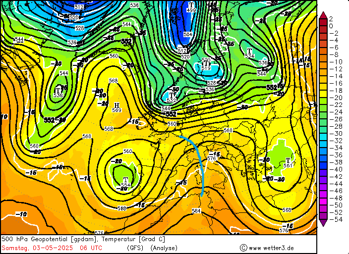 500 hPa relative Topophie u.a., GFS-Analyse um 06 UTC