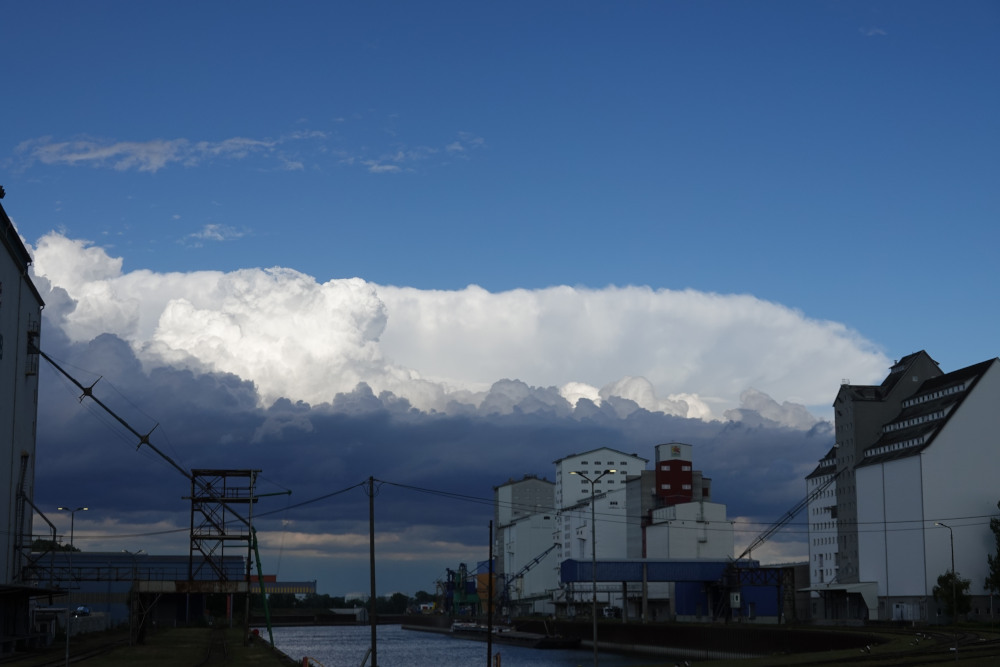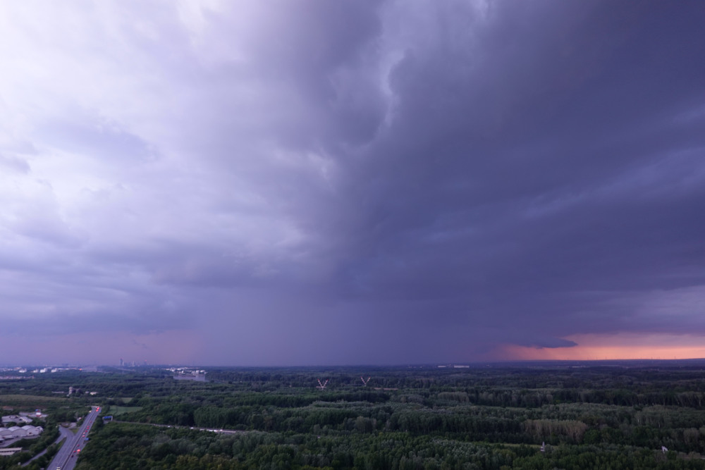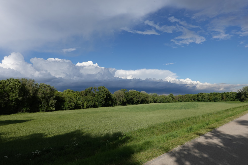 Die Konvergenz blieb im Weinviertel aufrecht mit einer höchst kontrastreichen Multizellenlinien, mit mehreren mächtigen Aufwindbereichen (Cumulus congestus) und dem Gewitteramboss im Hintergrund. Im Vordergrund die Felder jenseits vom Milleniumswald. Hinter dem Wald fließt die umgeleitete Schwechat entlang eines alten Donauarms, dem Ziegelwasser. Früher mündete sie weiter nördlich im Bereich des Albernen Hafens in die Donau.