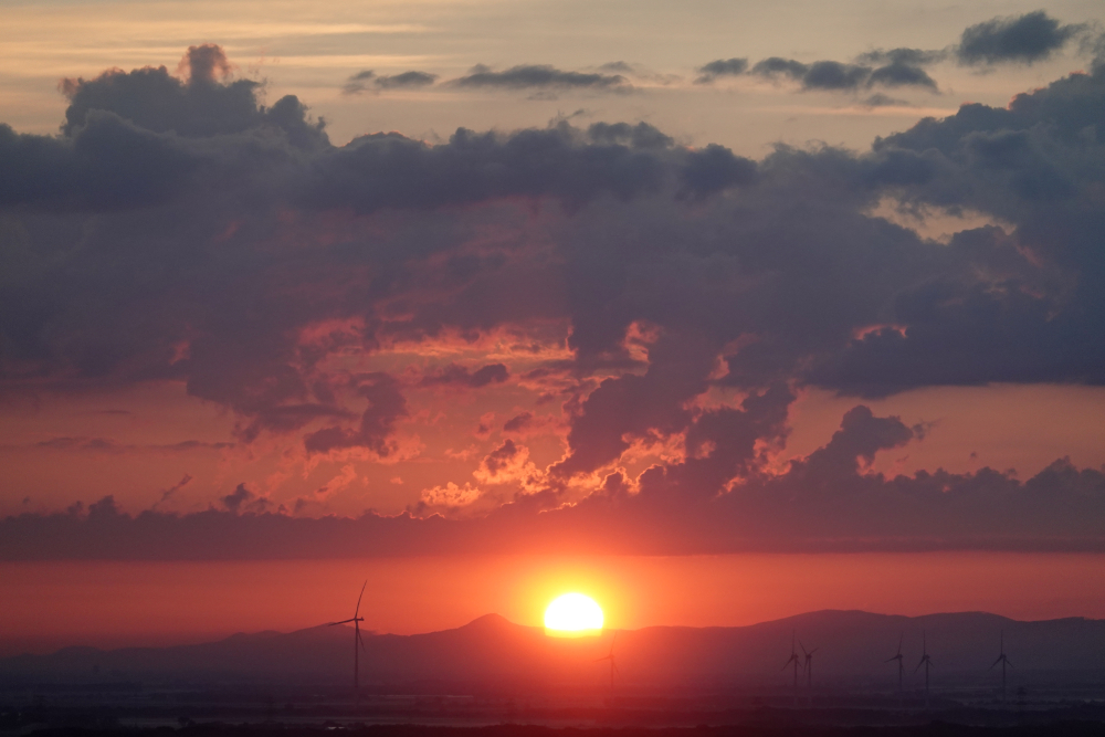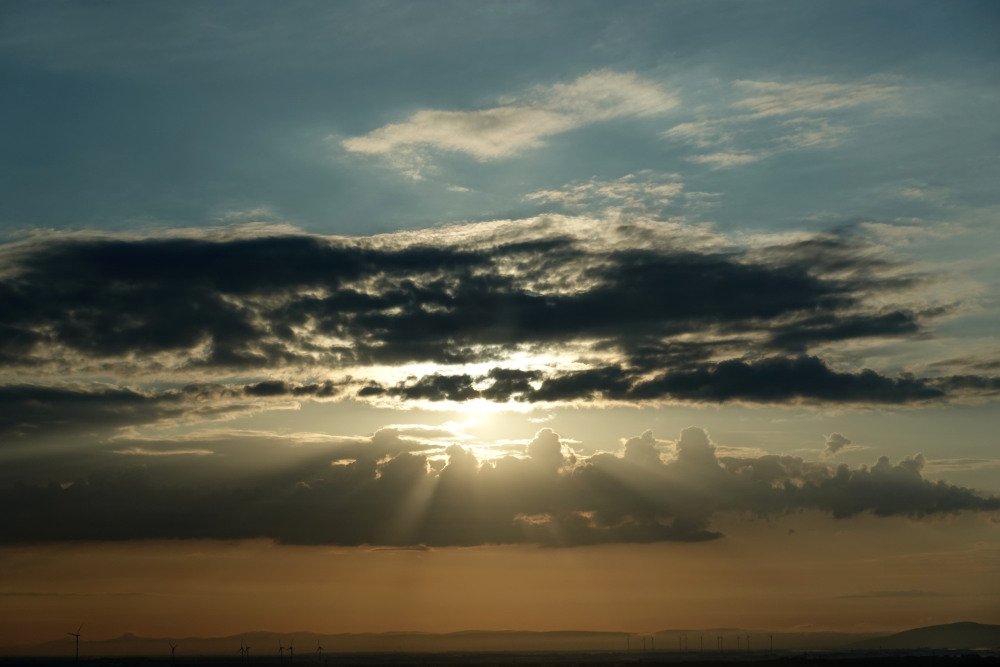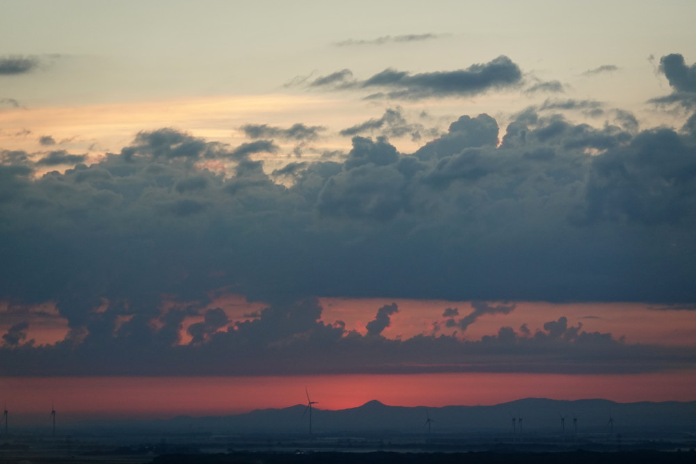 Sonnenaufgang mit zwei interessanten Schichten, die scheinbar übereinander liegen, aber die Altocumulus-Bank im Vordergrund mit den lehrbuchhaften zinnenförmigen Auswüchsen (castellanus) ist wahrscheinlich etwas näher zum Standort als die mächtige Quellwolkenbank dahinter. Hab ich in dieser Konstellation auch noch nicht gesehen. Möglich ist auch eine optische Täuschung und die Wolkenuntergrenzen sind ähnlich hoch.