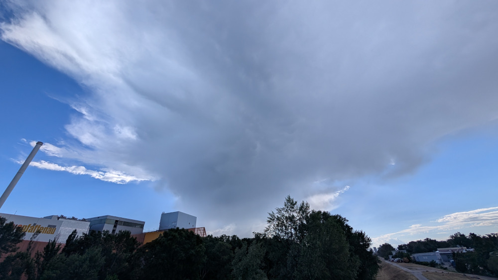 Knappe zehn Minuten später war vom Niederschlag nicht mehr viel übrig. Die Fallstreifen sah man noch. Der Ambossschirm wurde weit stromabwärts nach Osten ausgeweht. Ich bekam nur ein paar schüchterne große Regentropfen ab.