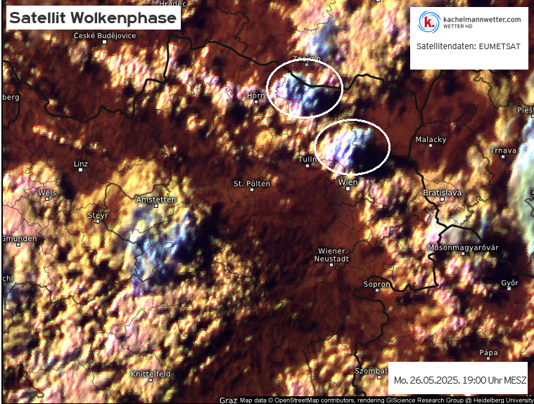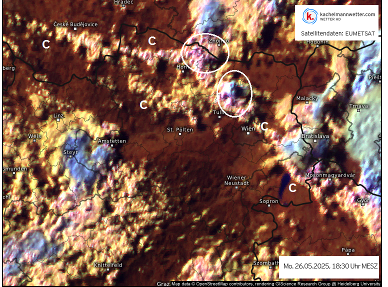 Das Satellitenbild zeigt mehrere kleinräumige Schauer- und Gewitterzellen, erkennbar am türkisfarbenen CB-Ambossschirm ( = dichte Eisbewölkung, kleine Partikel), etwa über Wien, im Weinviertel, über Mähren und auch nordöstlich von Bratislava. Kleinräumig intensiver Niederschlag fällt jeweils am Südrand bzw. Südwestrand der CBs, je heller der Ambossschirm, desto abgewehter vom Niederschlagskern.