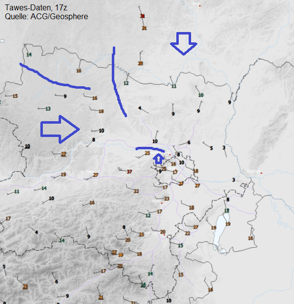 Der Grund für diese deutliche Verstärkung ist die Intensivierung der Bodenwindkonvergenz. Lebhafte Nordwinde über Mähren treffen auf mäßigen Westwind über dem Waldviertel und teilweise umgelenkten Südwestwind im Tullnerfeld. Die vorlaufende Zelle am Wienerwald zog ebenfalls entlang eines konvergenten Windfelds.