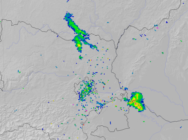 Das erste Gewitter schwächte sich ab, bevor es den Platz überquerte, die Blitze blieben nördlich der Donau. Im Platzbereich gab es gegen 20 Uhr kurzzeitig Niederschlagsraten von 26 bis 38mm pro Stunde.