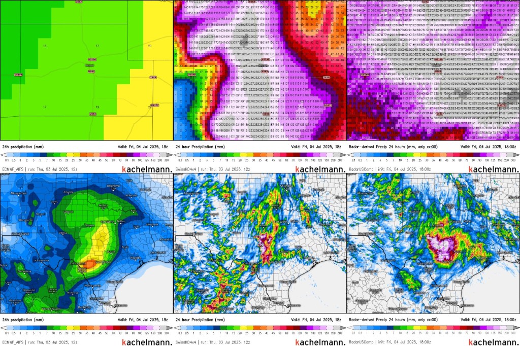 Das Schweizer Lokalmodell vom Donnerstag, 03.07., 12z (07 Uhr Lokalzeit in Texas), gültig bis Freitag, 04.07.18z (13 Uhr Lokalzeit) war vom Ort her richtig, hat die Ausdehnung und Intensität der Starkregenfälle aber unterschätzt. Das KI-Modell war mengen- und flächenmäßig völliger Schwachsinn.