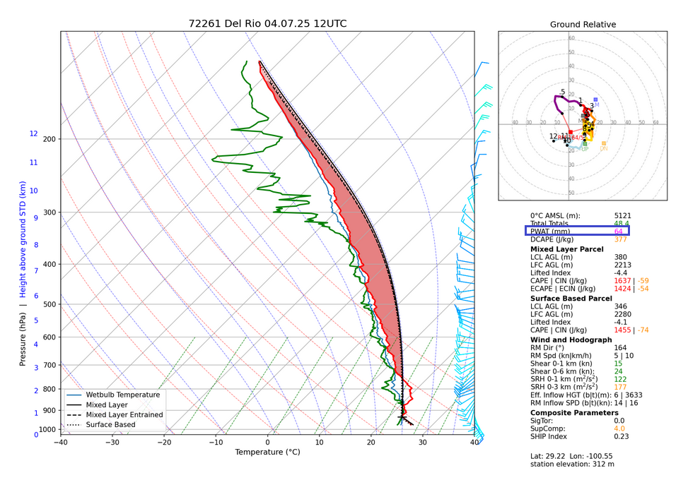 Der Wetterballonaufstieg von Del Rio, 07 Uhr a.m., kann als repräsentativ für die das Sturzflutereignis gelten, er zeigt die extrem hohen Taupunkte, eine insgesamt recht feuchte Atmosphäre und gleichzeitig hohe Labilität bis weit über 12km hinaus, wahrscheinlich bis zur Tropopause (hier nicht abgebildet). Gleichzeitig auch noch gut geschert und vor allem extrem hohe PWAT-Werte von 64mm.