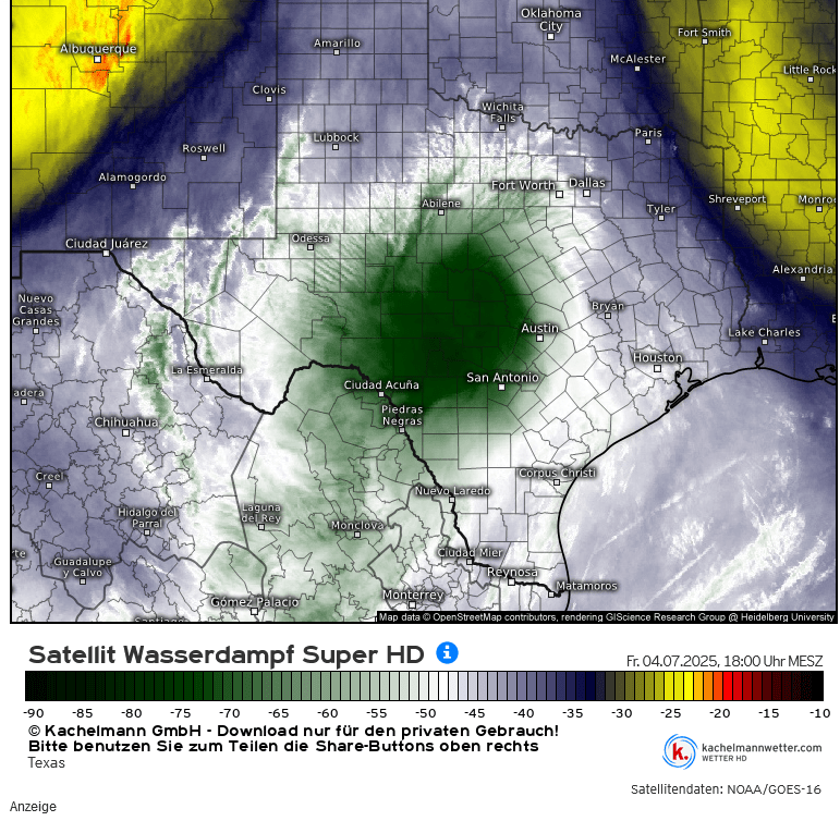 Wolkenobergrenzentemperatur am Freitag, 04. Juli 2025, 04 Uhr Lokalzeit (Texas), mit unter -70°C über den betroffenen Gebieten (Kerr County) und einem nahezu ortsfesten großen Gewittercluster (Quelle: kachelmannwetter.com)