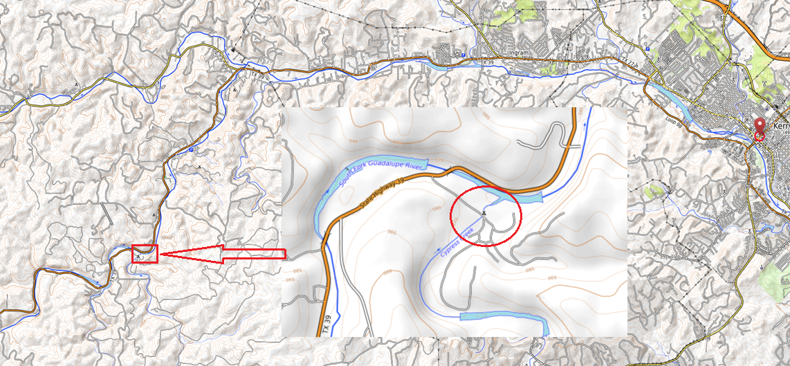 Lage des Sommercamps „Camp Mystic“ in Texas, 18 Meilen nordwestlich von Kerrville, am Guadalupe River, an der Mündung des Cypress Creek gelegen (Open Topo Map)
