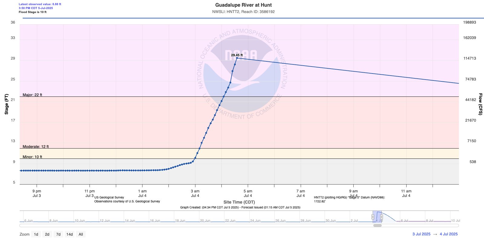 Guadalupe River Pegelstand bei Hunt, ein paar km stromabwärts von Camp Mystic (Quelle: NOAA/Dr. Robert Rohde, X)