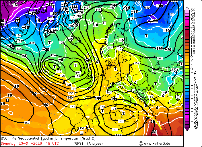 Mit der kräftigen Ostsüdostströmung wurde nordafrikanische Heißluft in die Zirkulation des Tiefdruckgebiets einbezogen – hier gut als Zunge höherer 850er Werte erkennbar („surface heat axis“):