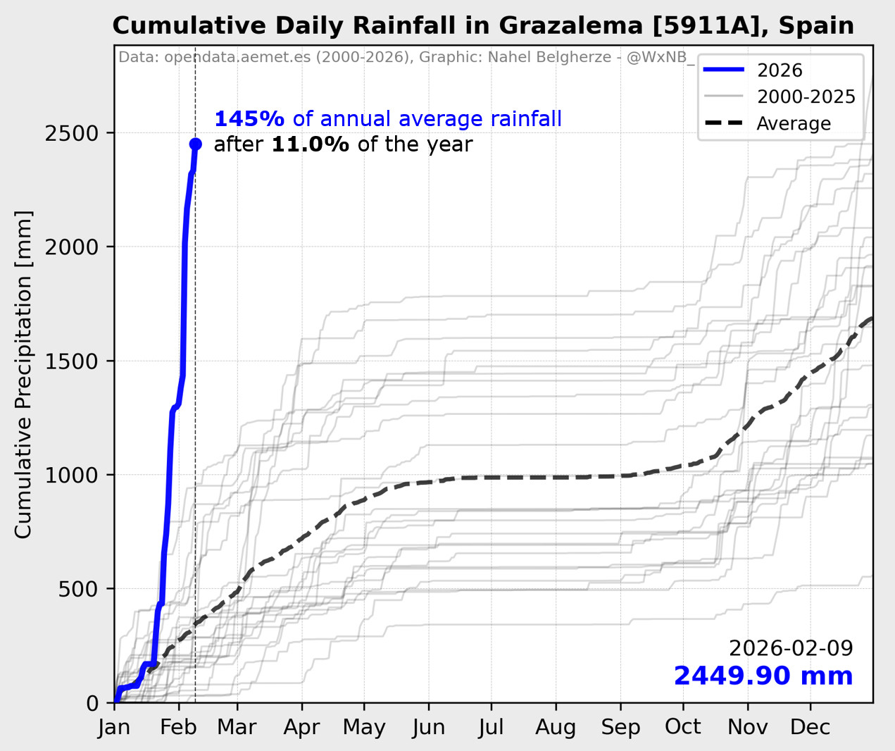 Das alles wäre nun nicht außergewöhnlich, sondern war der Normalfall vor den Dürrejahren, und das zeigt sich auch noch in den abgebildeten 26 Jahren von Grazalema. Das Ungewöhnliche an der aktuellen Lage ist in meinen Augen die Dauer dieser Wetterlage. Begonnen haben die Starkniederschläge etwa Mitte Jänner 2026.