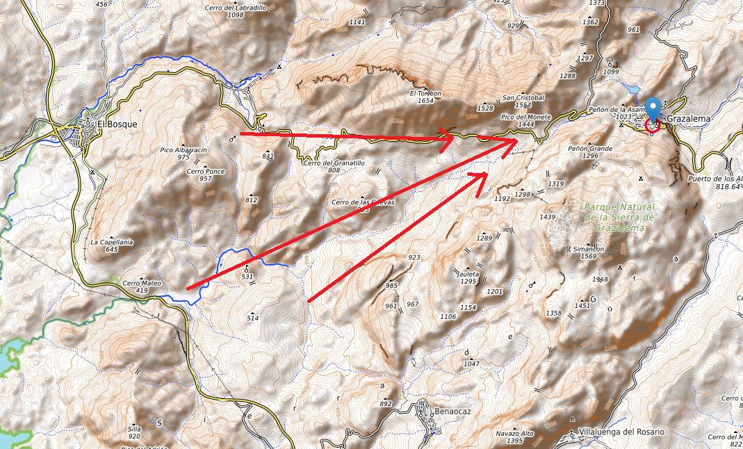 Der Ort Grazalema in Andalusien bringt es bereits nach zwanzig Tagen auf einen neuen Niederschlagsrekord mit 2449mm. Im Schnitt fallen hier im ganzen Jahr 1800-2200mm (1981-2010, klimatologischer Atlas Spanien). In den Nachbarorten wird nur rund ein Viertel dieser Niederschlagsmenge gemessen. Warum ist das so? Dafür müssen wir weiter hineinzoomen: