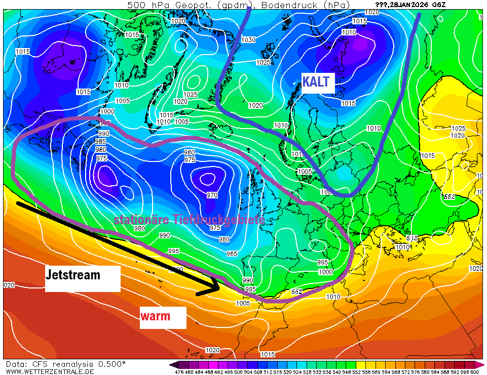 Über Skandinavien und Osteuropa hält sich seit etwa den Weihnachtsfeiertagen ein mächtiger Kaltluftkörper, gegen den die atlantischen Tiefdruckgebiete vergebens anrennen. Sie bleiben stattdessen über dem Nordatlantik stationär und regenerieren sich ständig weiter. Der Jetstream verläuft nicht über West- und Mitteleuropa, was uns (früher einmal) feuchtmilde Winter bescherte, aber zumindest genügend Niederschlag für ausreichend hohe Grundwasserstände für das Frühjahr und den Beginn der Vegetationsperiode, sondern weit südlich versetzt und quert damit die Iberische Halbinsel. Jetstreams sind der Motor für Tiefdruckgebiete bis hin zu Sturmtiefs. Und solange sich an dieser großräumigen Wetterlage nichts ändert, bleibt die stetige Feuchtezufuhr erhalten – und damit die Überschwemmungsgefahr sowie überdurchschnittlich hohe Grundwasserpegel. Die wärmeren luftmassen subtropischen Ursprungs über dem Atlantik werden dabei regelmäßig in die Tiefdruckentwicklung einbezogen und erhöhen dadurch die Niederschlagseffizienz (höhere absolute Feuchte, mitunter konvektiv durchsetzt).