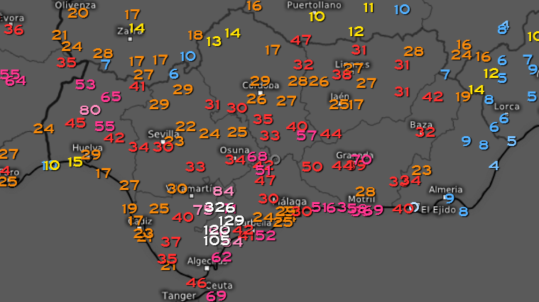Bei einem früheren Ereignis, wo weite Teile Andalusien von ergiebigen Regenfällen betroffen waen, fielen in Grazalema 326mm, in der Umgebung aber nur 70-90mm. In diesem Fall staute es aber auch an den Gebirgsketten südlich von Ronda mit über 100mm in 24 Stunden.
