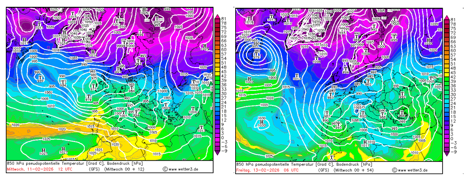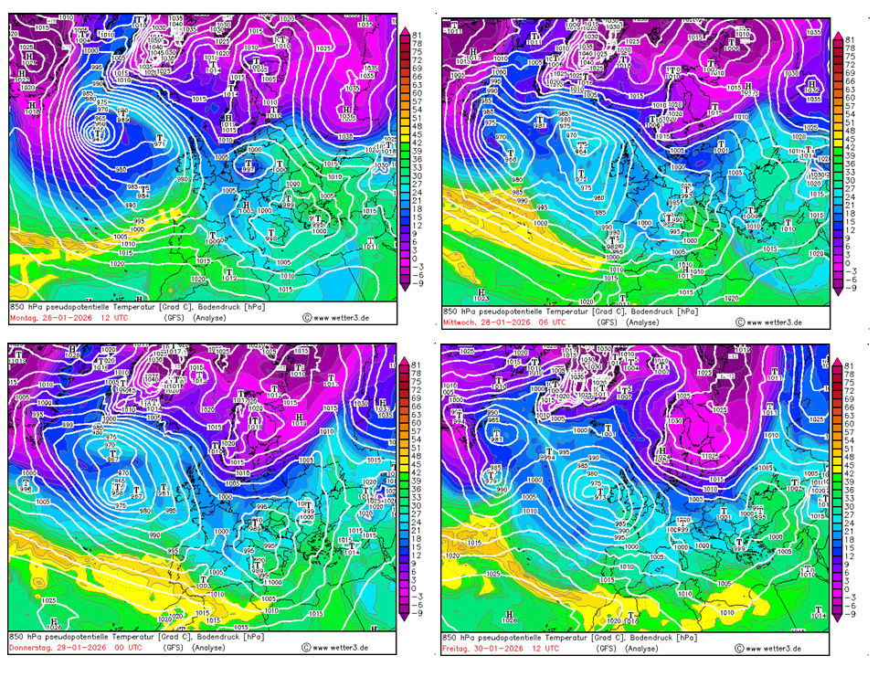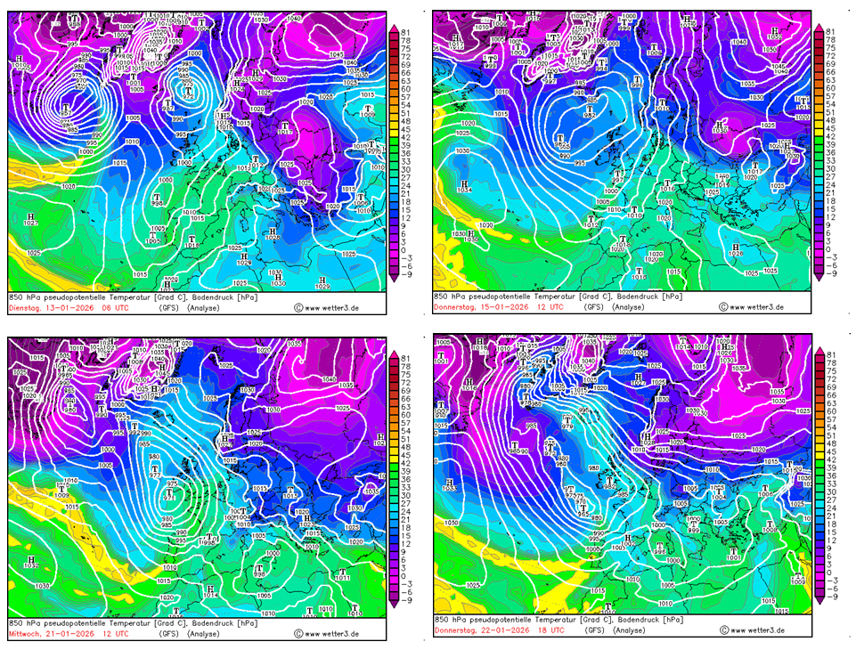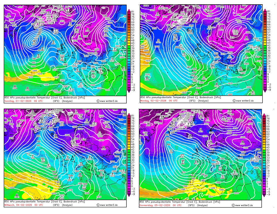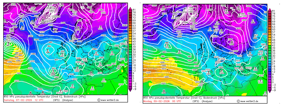 Nachfolgend der Einfachheit halber Bodendruck + 850hPa pseudopotentielle Temperatur (Quelle: wetter3.de/Archiv), um Intensität (via Bodendruck, Gradient pseudopotentielle Temperatur) und Energie der Luftmassen (Absolutwerte pseudopotentielle Temperatur) zu veranschaulichen: