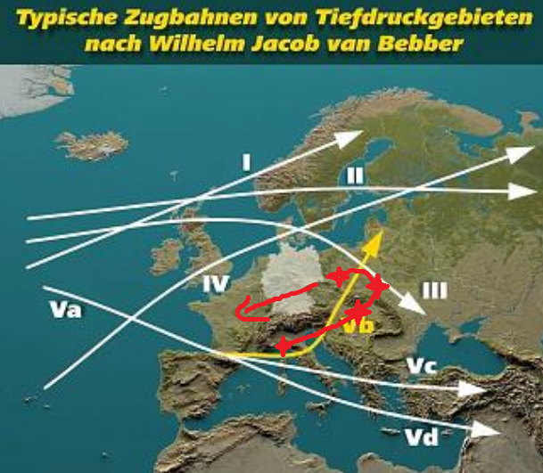 Auch wenn das in den Medien anders kommuniziert wird: Es handelte sich um KEINE klassische Vb-Lage! Das Tief entstand durch den Kaltlufteinbruch im Golf von Genua und zog zum Balkan, wurde dort stationär und zog am Ende retrograd mit der Ostströmung nach Frankreich ab. Über dem Balkan entstanden zudem mehrere Teiltiefs, weil sich dort das breite Höhentief festgesetzt hatte.