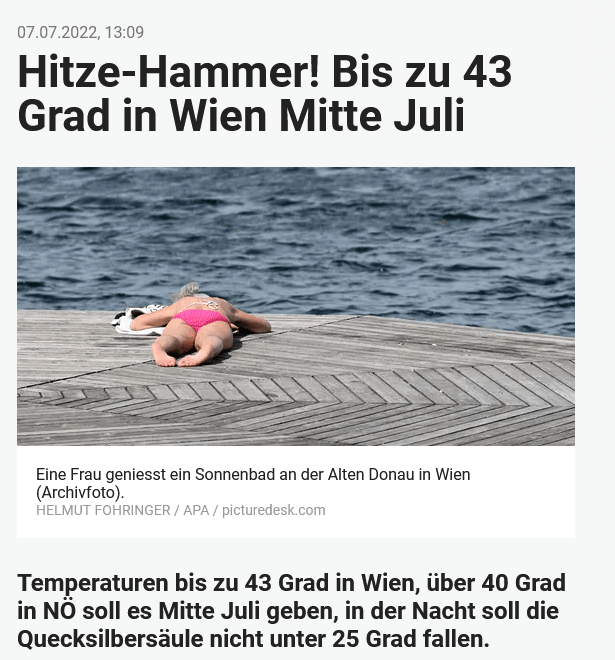 Um journalistische Qualität ist es in Österreich nicht gut bestellt. Das fängt bei falsch wiedergegebenen Polizeiberichten bei Bergunfällen an, geht über Fehler in den Sportnachrichten, über False Balance zur Pandemie bis hin zu reißerischen und oft falschen Darstellungen beim Wetter und Klima. Hier wollte die HEUTE natürlich unbedingt den 43er in den Titel bringen. Darunter ein völlig unpassendes Titelbild, denn bei 43°C „genießt“ niemand mehr ein Sonnenbad im Freien. Symptomatisch für die Verharmlosung der globalen Erhitzung.