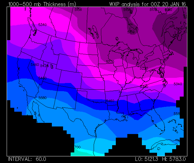 Zweitens kann ein Querschnitt die Gebiete mit CSI identifizieren. Eine Bedingung bei dieser Methode ist, dass der Querschnitt senkrecht zum thermischen Wind stehen muss. Dies kann getan werden, indem man einen 500-1000 hPa Schichtdicken-Plot heranzieht und den Querschnitt senkrecht zu den Schichtdickenkonturen plottet. Der thermische Wind weht parallel zu den Schichtdickenkonturen. Schneefallbänder, die durch CSI-Freisetzung entstehen, sind parallel zum thermischen Wind ausgerichtet.