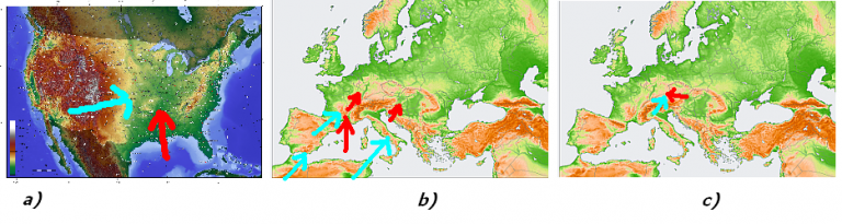 a) Der Klassiker: Zufuhr feuchtwarmer Luftmassen vom Golf von Mexico. Gleichzeitig wird über den Great Plains heiße Luft produziert und als EML ostwärts advehiert. Am Überschneidungsort braut sich das gefährliche Wetter in den USA mit Superzellen und Tornados zusammen. Dieser Mechanismus widerspricht den oft zitiertem „Zusammenprall“ von warmen und kalten Luftmassen.