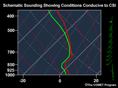 Im Skew-T-Diagramm muss das Vertikalprofil nahezu gesättigt sind. Dann kommt der bedingte (conditional) Anteil der CSI ins Spiel. Ebenso eine Rechtsdrehung des Windes mit der Höhe (Warmluftadvektion). Auf der antizyklonalen Seite eines Jetstreams kann CSI freigesetzt werden.