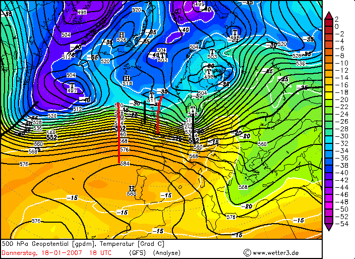 Donnerstag, 18. Januar 2007, 18 UTC – 500hPa+Temperatur, 850hPa+Temperatur