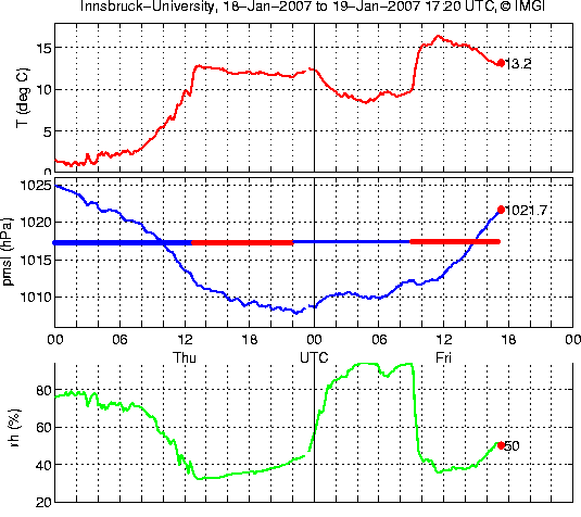 Um 9 UTC brach in Innsbruck mit plötzlicher Winddrehung von Nordost auf West der Nordföhn durch. Der Wind erreichte selbst im 1min-Mittel bis 40km/h an der Universität, mit dem Handwindmesser maß ich um 14.20 UTC auf der Blasius-Huber-Brücke 54km/h als Böe. Die teilautomatische Station am Flughafen meldete bis 15 UTC eine Spitzenböe von 101km/h. Mit dem durchbrechenden Nordföhn hörte es kurzzeitig auf zu regnen, die Universität registrierte sogar wenige Minuten Sonnenschein. Der markante Feuchterückgang von 90 auf unter 40%, Druckfall und Temperatursprung weisen eindeutige Föhnindikatoren auf.