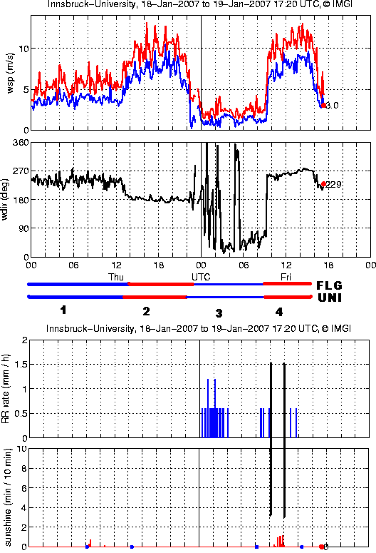 Der Föhndurchbruch an der Universität fand um 13 UTC statt, zeitverzögert um eine Stunde später am Flughafen – was sehr häufig der Fall ist. Ursache ist die unterschiedliche geographische Lage im Inntal. Die Universität liegt mehr in der Talachse des Wipptals, der Flughafen westlich der Talmündung. Mit Föhndurchbruch wechselte der Wind an der Universität auf einen konstanten Südwind. Mittelwinde und Böigkeit nahmen deutlich zu, blieben aber verhältnismäßig dicht beieinander. Indiz für eine sehr stabile Föhnströmung.