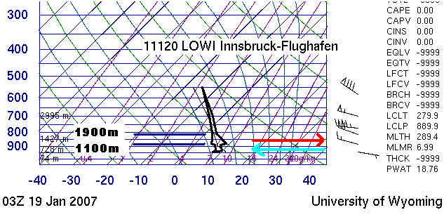 Eine mögliche Begründung der besonderen Windsituation liefert folgender, unvollständiger Radiosondenaufstieg von Innsbruck, Freitag, 19. Januar 2007, 3 UTC.