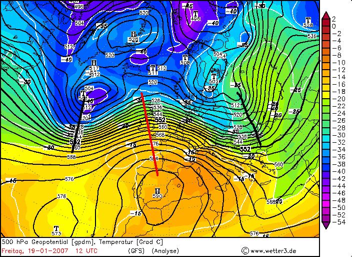 Freitag, 19. Januar 2007, 12 UTC – 500hPa+Temperatur, 850hPa+Temperatur