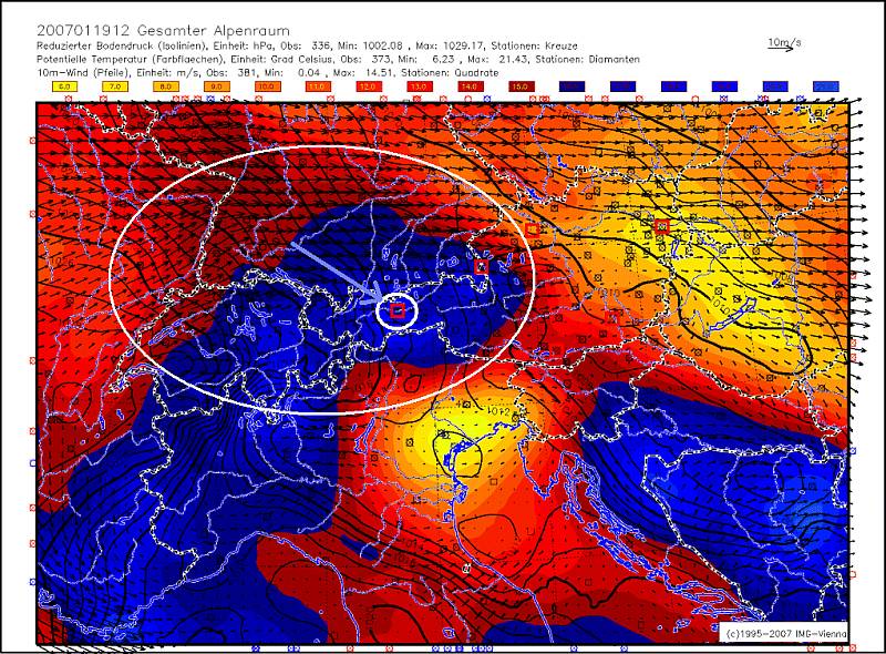 ⇒ Für Innsbruck reicht theoretisch die starke Westkomponente über dem Alpenvorland, die parallel zu den Alpen verläuft, nicht für einen klassischen Nordföhndurchbruch aus. Da aber der hydrostatische (!) Gradient, impliziert durch das Gefälle der potentiellen Temperatur, Nordwest- Südost nach Innsbruck ausgerichtet ist (angedeutet durch den hellblauen Pfeil), konnte sich eine Nordwestkomponente über Lechtaler Alpen und Wettersteingebirge bis zum Inntal aufbauen, und als Nordföhn nach Innsbruck gelangen. Westföhn über den Vorarlberg ist wegen dem fehlenden Druck- und Temperaturgradienten dort auszuschließen.