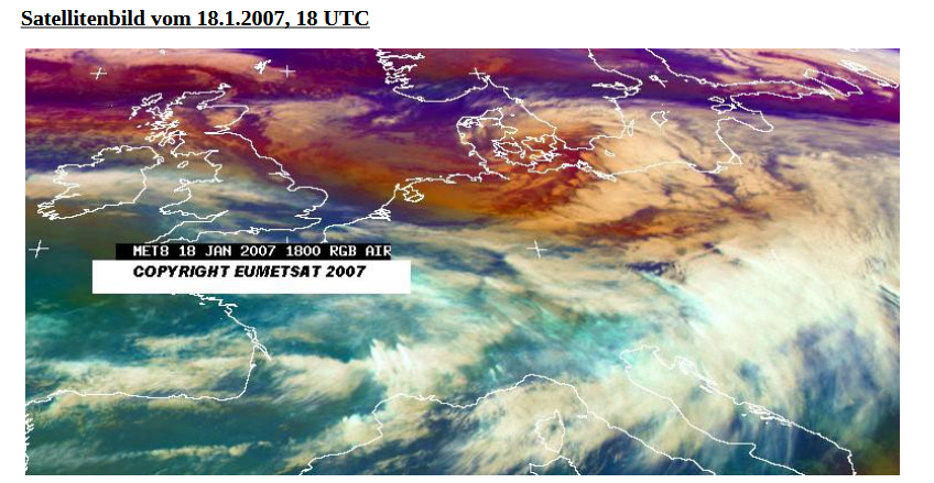 Das Satellitenbild von Freitag, 19. Januar 2007, 10 UTC zeigt die Situation bei Nordföhn in Innsbruck sowie in Norditalien. Orkantief „Kyril“ liegt unter langsamem Okkludierungsprozess über Osteuropa. Über Mitteleuropa befindet sich eine Wellenstörung, die wegen dem keilvorderseitigen Absinken im Kaltfront- und Okklusionsbereich sehr niedrige Wolkenobergrenzen aufweist. Besonders über Süddeutschland treten dabei noch längere, teils ergiebige Niederschläge mit Überschwemmungen auf. Entlang der Nordalpen ist Staubewölkung erkennbar, die aufgrund der intensiven Höhenströmung teilweise über den Alpenhauptkamm reicht. Hinsichtlich der Niederschläge bei Nordföhn in Innsbruck spielt die intensive Höhenströmung eine tragende Rolle. Südlich der Alpen ist es wegen dem föhnigen Absinken wolkenlos. Über und westlich der Britischen Inseln sind weitere Wellenbildungen zu sehen, die im Seegebiet vor Irland auch zur erwähnten Zyklogenese führten.