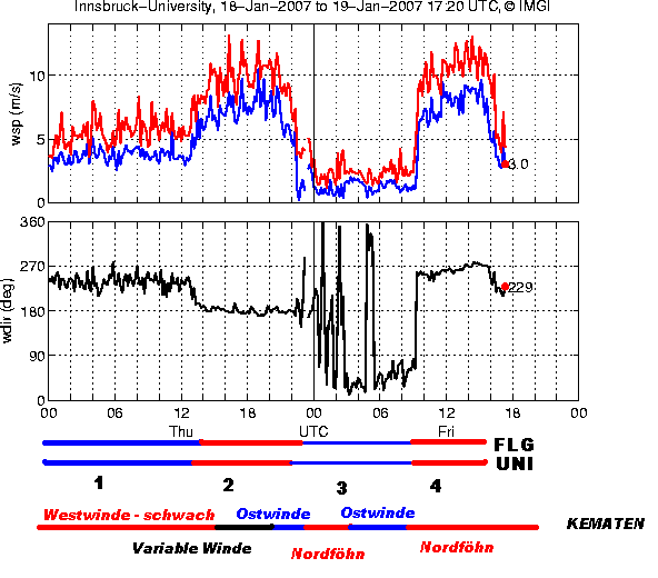 Folgendes Diagramm ergänzt das obige Winddiagramm der Universität Innsbruck um die Winddaten der Station Kematen vom 18. und 19. Jänner 2007: