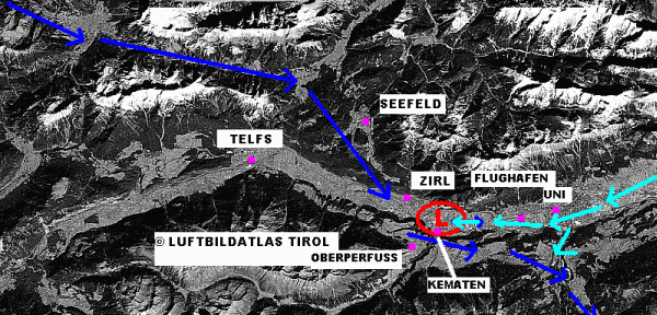 Nachdem die Zeitpunkte des vorföhnigen Ostwindes und des Nordföhns in Innsbruck geklärt sind, möchte ich diese Analyse mit den Stationsdaten von Kematen, Besitz der Austro Control, abschließen. Kematen befindet sich 6km westlich des Innsbrucker Flughafens und 9km westlich von der Universität Innsbruck entfernt unmittelbar am Ausgang des Sellraintals (s. Skizze unten). Es wird dadurch von wenigstens drei Windsystemen beeinflusst, dem Tal(aus)windsystem des Sellraintals mit südlichen Winden, dem Talwindsystem des Inntals mit West- und Ostwind sowie dem Nordföhn über Seewald und Hohe Wand (westlich von Seefeld).