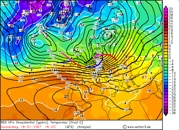 Donnerstag, 18. Januar 2007, 18 UTC – 500hPa+Temperatur, 850hPa+Temperatur