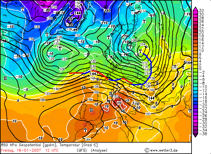 Freitag, 19. Januar 2007, 12 UTC – 500hPa+Temperatur, 850hPa+Temperatur