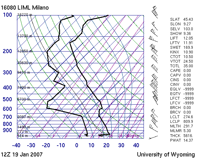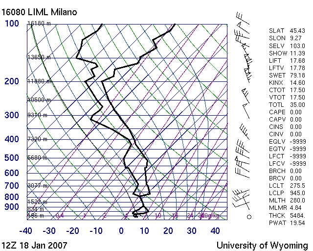 Radiosondenaufstiege von Mailand am 18. und 19. Jänner 2007, jeweils 12 UTC