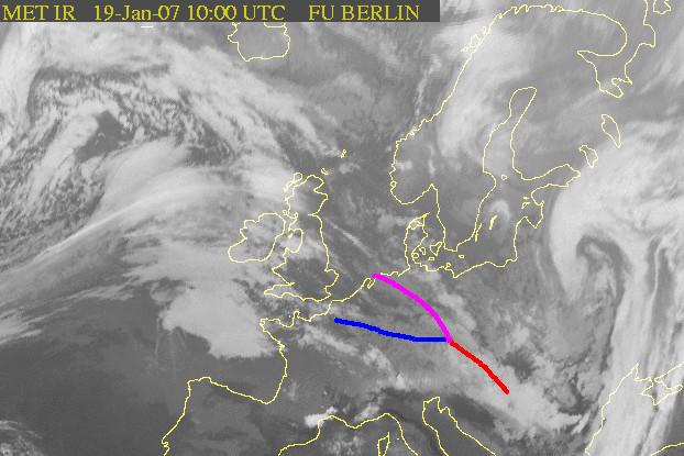 Das Satellitenbild von Freitag, 19. Januar 2007, 10 UTC zeigt die Situation bei Nordföhn in Innsbruck sowie in Norditalien. Orkantief „Kyril“ liegt unter langsamem Okkludierungsprozess über Osteuropa. Über Mitteleuropa befindet sich eine Wellenstörung, die wegen dem keilvorderseitigen Absinken im Kaltfront- und Okklusionsbereich sehr niedrige Wolkenobergrenzen aufweist. Besonders über Süddeutschland treten dabei noch längere, teils ergiebige Niederschläge mit Überschwemmungen auf. Entlang der Nordalpen ist Staubewölkung erkennbar, die aufgrund der intensiven Höhenströmung teilweise über den Alpenhauptkamm reicht. Hinsichtlich der Niederschläge bei Nordföhn in Innsbruck spielt die intensive Höhenströmung eine tragende Rolle. Südlich der Alpen ist es wegen dem föhnigen Absinken wolkenlos. Über und westlich der Britischen Inseln sind weitere Wellenbildungen zu sehen, die im Seegebiet vor Irland auch zur erwähnten Zyklogenese führten.