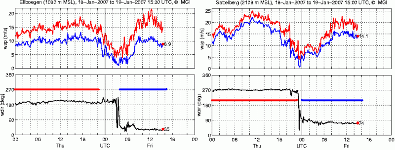 Es zeigt überwiegend schwache Westwinde vom 18. Januar 2007, 00 UTC bis etwa 14 UTC. Danach wird eine große Schwankungsbreite in der Windrichtung sichtbar, ehe kurz nach 20 UTC überwiegend Ostwinde dominieren. Von 23 UTC bis 2.30 UTC weht kräftiger Westwind aus westsüdwestlicher Richtung mit Mittelwinden um 15kt und 23-33kt Böen. Danach dreht der Wind erneut auf östliche Winde zurück, die zeitweise auch in Westwind umschlagen, dabei jedoch keine signifikante Erhöhung der Windgeschwindigkeit zeigen. Um 8.50 UTC dreht der Wind nochmals auf West, zeitweise auch Nordwest, und nimmt deutlich an Stärke zu. Er erreicht Mittelwinde bis 30kt und Windspitzen bis 48Kn. Nach 20.20 UTC stellt sich wieder Ostwind ein.