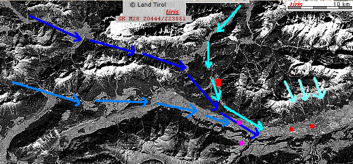 ⇒ Für Innsbruck reicht theoretisch die starke Westkomponente über dem Alpenvorland, die parallel zu den Alpen verläuft, nicht für einen klassischen Nordföhndurchbruch aus. Da aber der hydrostatische (!) Gradient, impliziert durch das Gefälle der potentiellen Temperatur, Nordwest- Südost nach Innsbruck ausgerichtet ist (angedeutet durch den hellblauen Pfeil), konnte sich eine Nordwestkomponente über Lechtaler Alpen und Wettersteingebirge bis zum Inntal aufbauen, und als Nordföhn nach Innsbruck gelangen. Westföhn über den Vorarlberg ist wegen dem fehlenden Druck- und Temperaturgradienten dort auszuschließen.
