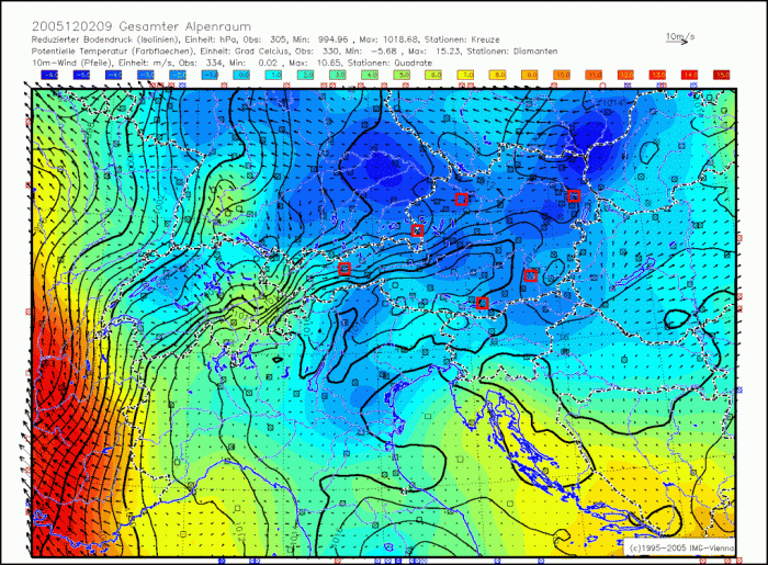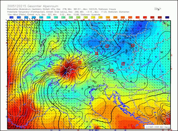 Die Analyse vom 2. Dezember, 6 UTC zeigt ein mesoskaliges Kältehoch über dem zentralen Alpenraum, welches ein Maximum von 1019hPa in Südtirol aufweist. Das potentielle Temperaturminimum ist jedoch nach Osten hin verschoben. Zwischen Reschenpass und Bregenz existiert bereits ein horizontaler Druckunterschied von 11hPa auf 100km. Da der hydrostatische Gradient aber viel schwächer, gab es noch keine starken Windgeschwindigkeiten an den föhnbegünstigten Stationen im Vorarlberg.