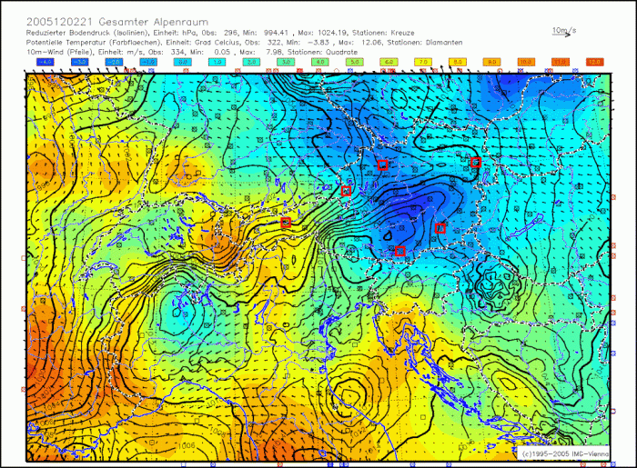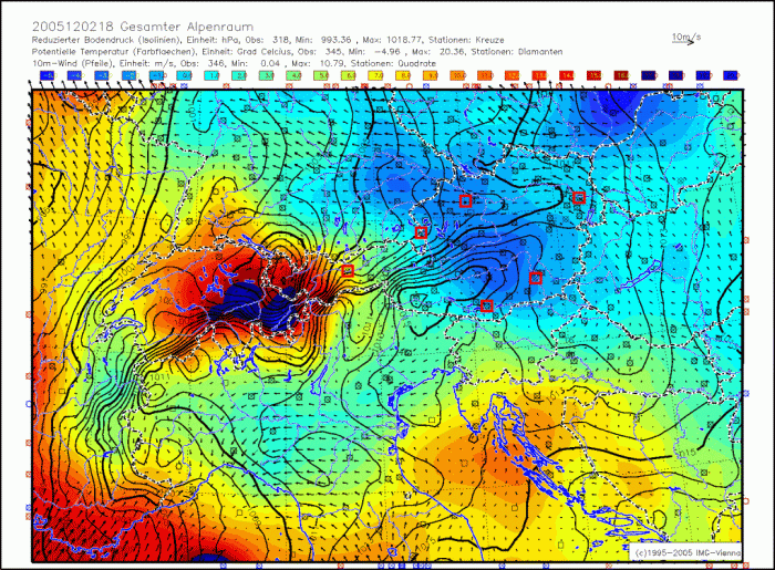 Um 0 UTC stellt sich eine interessante Sitation ein – während in den Hochlagen Föhnmaxima erreicht werden, bricht der Föhn in Innsbruck zusammen. Anhand des Isobarenverlaufs lässt sich aber weiterhin eine starke Nord-Süd-Drängung beobachten (5hPa), ebenso ein potentieller Temperaturgradient zwischem kalten Bozen und wärmeren Inntal. Ab 0 UTC ist jedoch eine deutliche Entschärfung aller dynamischen und hydrostatischen Gegensätze festzustellen – die Föhnströmung nahm ab diesem Zeitpunkt deutlich an Stärke ab und brach schließlich am frühen Morgen mit Frontdurchgang zusammen.