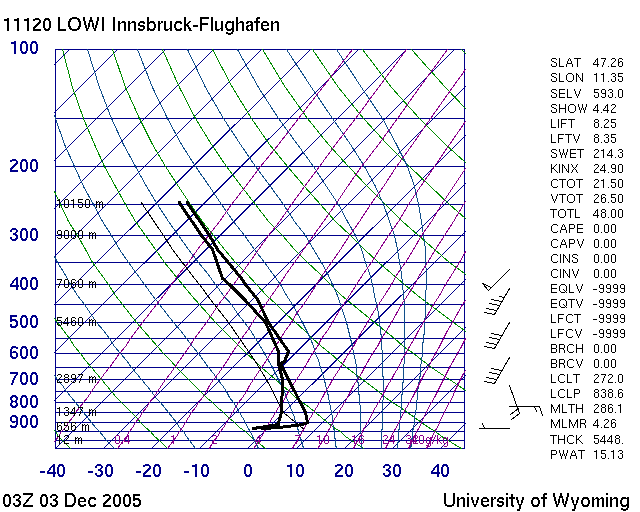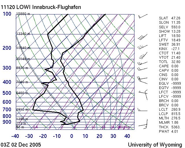 Zunächst die Radiosondenaufstiege Innsbrucks vom 2. bzw. 3. Dezember 2005 , jeweils 3 UTC