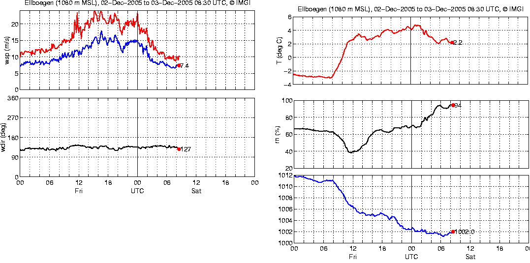 In Ellbögen im unteren Wipptal nahe dem Fuß des Patscherkofels herrschte im gesamten Zeitraum Talauswind und Föhn.Wichtigstes Indiz dafür ist die relativ konstante Südostströmung sowie die im Vergleich zum Mittelwind um 3-4m/s , später auch bis 8m/s erhöhte Böigkeit. Bei den anderen Parametern gibt es längst nicht so sichtbare Sprünge wie in Innsbruck – das spricht für die Lage in der (stabilen) Föhnschicht. Es lässt sich aber ein Föhnmaximum zwischen 12 und 0 UTC konstatieren.